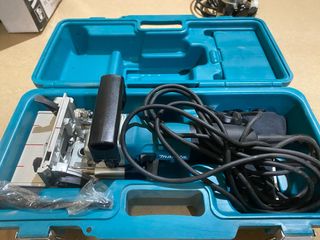 Engalletadora de carpintería Makita en su maletín. - Maletín de transporte azul. - Herramienta con cable de alimentación.