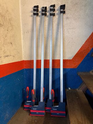 Abrazadera paralela de la marca Juuma. Ideal para trabajos de carpintería o bricolaje. - Medidas: 1000x95 mm. - Cuerpo principal de metal. - Mordazas de plástico protectoras. Son magníficas. Las he usado para hacer mis bancos de trabajo pero ahora las cosas que voy a hacer no requieren de ese largo. 45€ C/u. 160€ las cuatro. Recogida en persona en zona Bernabéu-Tetuán.