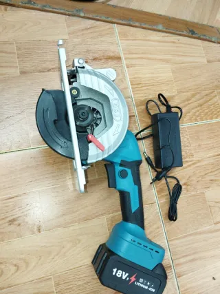 Sierra circular recargable de 18V, ideal para trabajos de carpintería y bricolaje. Incluye cargador. - Diseño ergonómico para un agarre cómodo. - Batería de iones de litio de 18V. - Protector de hoja para mayor seguridad.