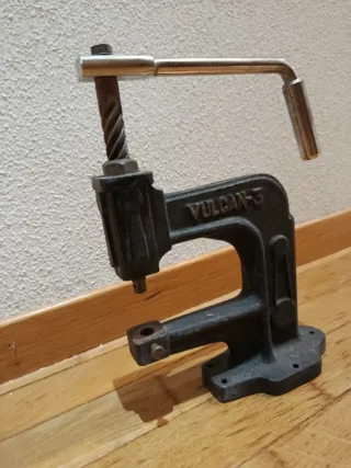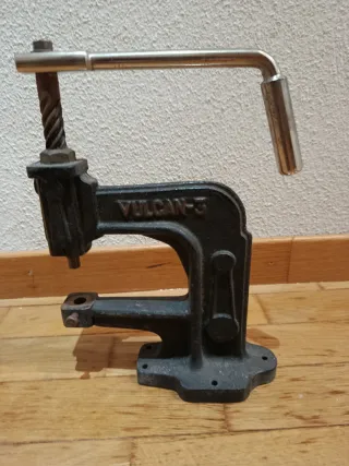 Máquina de remaches VULCAN-S de hierro fundido. Ideal para trabajos de artesanía o reparación. - Construcción robusta de hierro fundido. - Palanca de metal para aplicar presión. - Base estable con orificios para fijación.