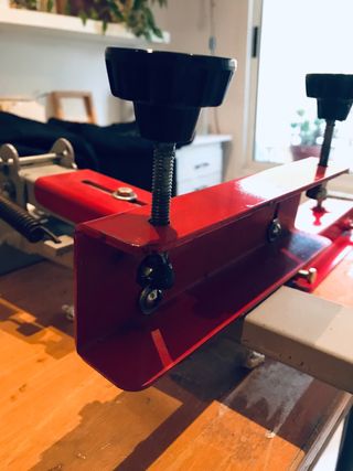 Máquina de serigrafía diseñada para pantallas de aluminio. Su estructura es de color rojo brillante y cuenta con dos perillas negras para ajuste. - Construcción robusta en metal. - Acabado en pintura roja. - Incluye perillas de ajuste.