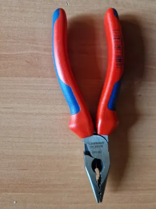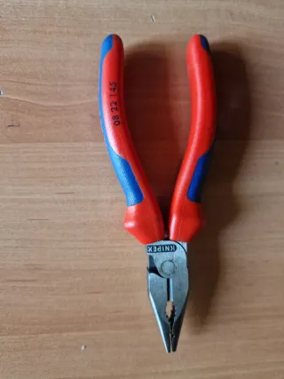 Alicates de punta universal de la marca Knipex. Herramienta versátil para diversas tareas. - Mango ergonómico con zonas de agarre en rojo y azul. - Punta de sujeción dentada. - Marcado con el número de modelo 08 22 145. Palmera wera wiha irimo acesa beta bahco knipex wurth stahlwille Stanley facom bellota ht usag nws unior herramientas electricidad electricista mecánica mecánico ferretería hitachi hikoki construcción fontanería fontanero mantenimiento fluke