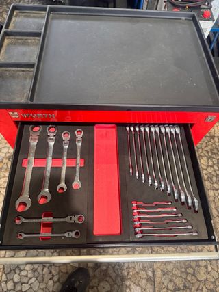 Cajón de herramientas Würth en color rojo, ideal para organizar tu taller. - Incluye todas las herramientas. - Diseño con múltiples cajones. - Asa lateral para facilitar el transporte.