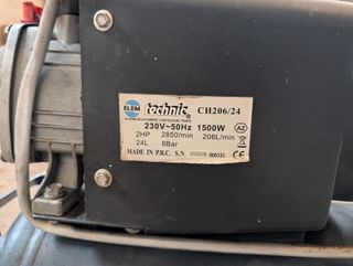 Compresor de aire marca ELEM Technic, modelo CH206/24. • Potencia: 2 HP (1500W). • Capacidad: Tanque de 24 Litros. • Presión: 8 Bares. • Caudal: 206 Litros/min. • Estado: Usado, funciona perfectamente. Incluye su caja original para transporte. Ideal para tareas de bricolaje, inflado de ruedas, limpieza con aire o pintura ligera. Se vende por liquidación de taller. Ver más productos en mi perfil.