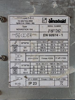 Se vende por liquidación de taller. Soldador inverter profesional marca Sincosald, modelo Novastick 164. Características: • Rango: 10A a 160A. • Ciclo de trabajo: 160A al 30% y 95A al 100% (uso continuo). • Tensión: 220V. • Fabricación italiana de calidad. Incluye todo lo que se ve en las fotos: • Maletín de transporte rígido original. • Cables con pinza de masa y portaelectrodos. • Cepillo de alambre. • Manuales. Equipo usado pero robusto y fiable, ideal para cerrajería y reparaciones.