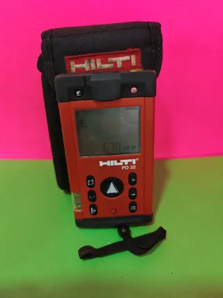 Medidor láser Hilti PD 32 en color naranja. Incluye funda protectora. - Pantalla digital. - Botones de control. - Correa de sujeción. Somos tienda física en Fuenlabrada. Calle la plaza N1. Información 916902694