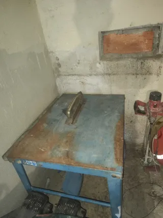 Mesa de corte robusta, ideal para trabajos industriales. Su estructura metálica azul garantiza durabilidad. - Motor eléctrico incluido. - Base con ruedas para fácil movilidad.