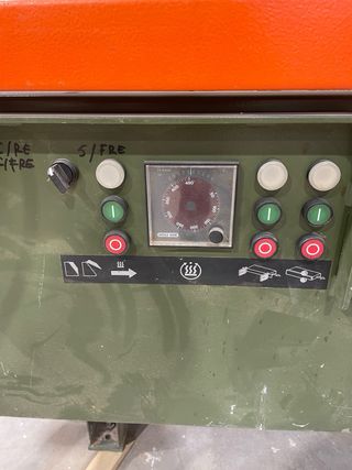 Canteadora industrial Holz-Her Express 1433. - Panel de control con botones. - Cinta transportadora naranja. - Estructura metálica verde.