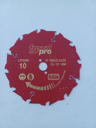 Disco de corte Freud Pro para madera. - Diámetro: 180 mm. - Grosor: 2.4 mm. - Eje: 20 mm. - Número de dientes: 12. - Recubrimiento industrial Teflon®. - Velocidad máxima: 10500 RPM.