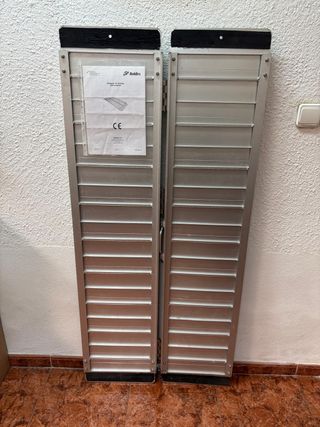 Juego de rampas portátiles de carga para uso industrial o particular. Ideales para cargar motos, maquinaria o equipos pesados en furgonetas y remolques. Fabricadas en material resistente y diseñadas para ofrecer estabilidad y seguridad. En buen estado general. Perfectas para profesionales o uso ocasional.