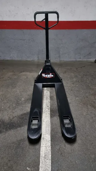 Transpaleta manual marca Cevik Pro con capacidad de carga de 2500 kg. - Color negro. - Ruedas dobles para facilitar el movimiento, esta prácticamente nueva porque usamos para descargar2 camiones de cajas de zapatos, se recoge en pedralbes