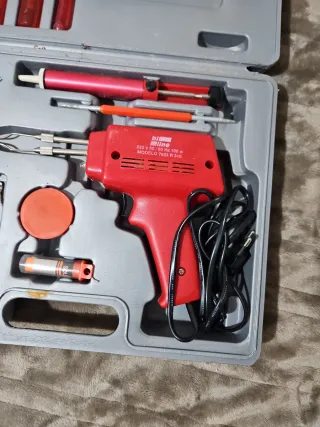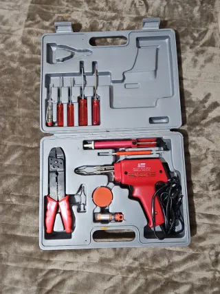 Kit de soldador eléctrico con varias herramientas incluidas. Ideal para reparaciones y proyectos. - Soldador eléctrico rojo. - Alicate pelacables y crimpadora. - Juego de destornilladores. - Accesorios para soldador. LE FALTA EL ALICATE