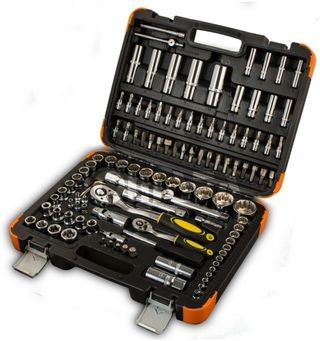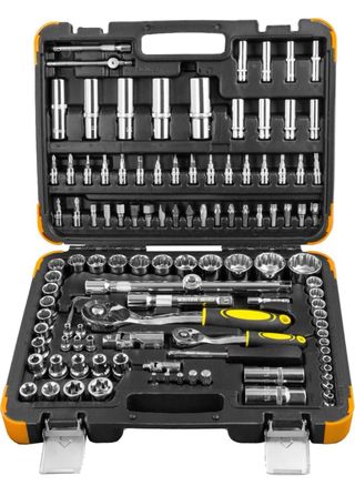 Estuche de herramientas de 113 piezas con vasos de 12 caras. - Fabricado en cromo vanadio. - Herramientas de 1/2” y 1/4". - Carraca con mango bi-compuesto y agarre ergonómico. - Contiene llaves, vasos, puntas de 8 mm, adaptadores, extensiones, carracas...