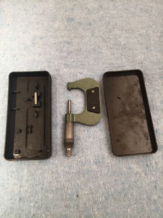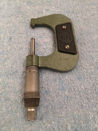 Micrómetro de la marca Borletti. - Cuerpo metálico verde. - Tambor graduado plateado.