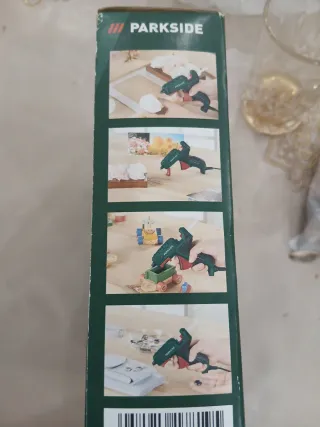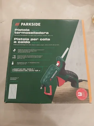 Pistola de cola caliente Parkside. - Modelo: PNKP 105 C2 - Potencia nominal: 6 W (20 W al arranque) - Punto de fusión: 80°C (±5 °C) - Temperatura máxima: 140 °C - Longitud del cable: 1,8 m