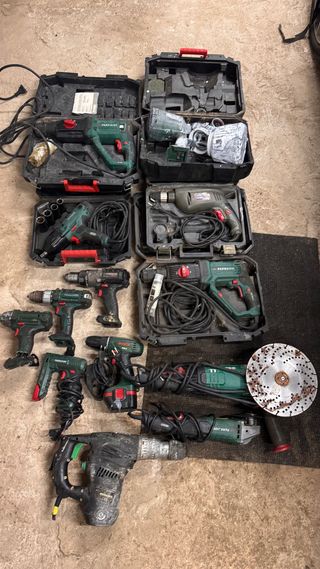 Conjunto de herramientas eléctricas variadas, incluyendo taladros, martillos y amoladora. - Taladro percutor Parkside. - Taladro atornillador Parkside. - Taladro atornillador Bosch. - Martillo demoledor. - Amoladora angular Parkside. - Amoladora pequeña Parkside. - Taladro de columna Parkside. - Maletines de transporte incluidos. algunas funcionan y otras ay que cambiarle las escobillas