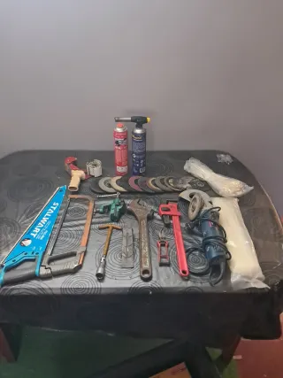 Conjunto de herramientas manuales y de corte.usado pero todo funcional - Mordaza de banco - Llave de tubo - Llave inglesa - Llave de fontanero - Tijeras de podar - Amoladora angular - Discos de corte y desbaste