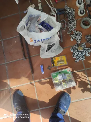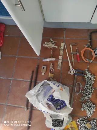 Lote de herramientas y accesorios varios. - Bolsa con herramientas y accesorios. - Cadenas de metal. - Candado. - Ruedas. - Cerraduras.