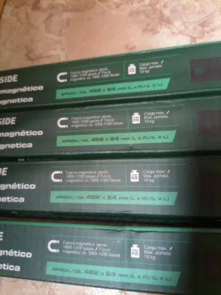 Lote de cuatro barras magnéticas de la marca PARKSIDE. Son ideales para organizar herramientas. - Longitud aproximada: 452 mm. - Fuerza magnética: 1000-1200 Gauss. - Capacidad de carga máxima: 10 kg.