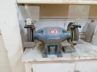 Esmeril de banco con dos discos de lijado. - Cuerpo metálico azul. Vale a 380v - Protector de seguridad transparente en cada disco. - Interruptor de encendido/apagado. - Soporte para herramientas.