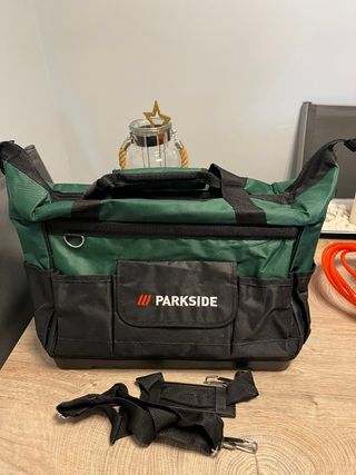 Práctica bolsa de herramientas de la marca Parkside, ideal para organizar y transportar tus herramientas. Sin uso Parkside 30 litros 39x18,5x37 - Color verde y negro. - Compartimentos exteriores. - Correa ajustable para el hombro.