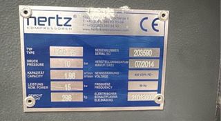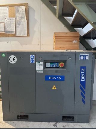 Compresor de aire marca Hertz, modelo HGS 15. - Color gris. - Incluye placa de características y advertencias de seguridad. - Diseño industrial. - Año 2014 - muy pocas horas trabajadas