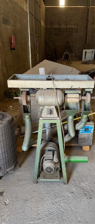 Piedra de afilar de uso industrial, montada sobre un soporte metálico azul en muy buen estado. - Motor eléctrico. - 2 Discos de amolar. - Interruptor de encendido/apagado.
