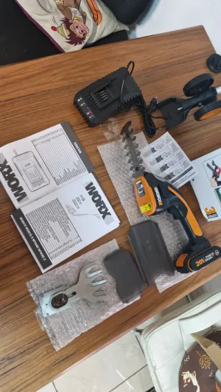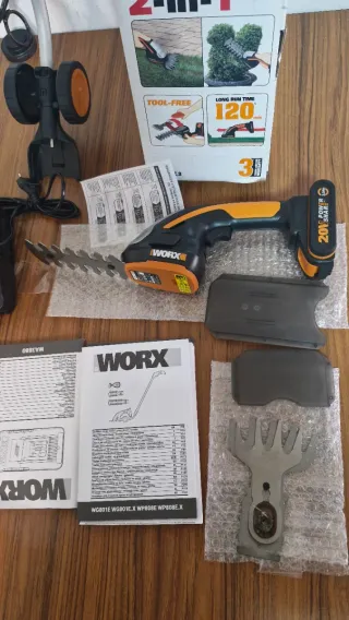 Herramienta inalámbrica WORX 20V, ideal para el cuidado de tu jardín. - Incluye cortasetos y cizalla para césped. - Batería de 20V. - Cargador incluido.
