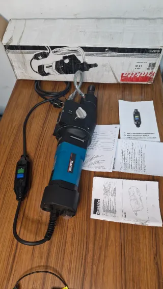 Taladro de diamante de la marca Makita. Herramienta eléctrica con diseño ergonómico. - Cuerpo principal en color azul y negro. - Incluye manguera de refrigeración. - Dial de ajuste plateado.