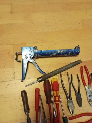 Conjunto de herramientas manuales para diversas tareas. - Pistola de silicona azul. - Lima de metal. - Variedad de destornilladores. - Alicates y pinzas.