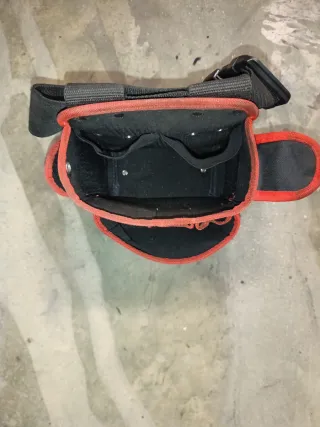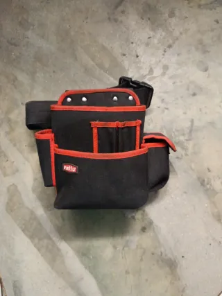 Práctica bolsa de herramientas de la marca Ratio, ideal para organizar y transportar tus herramientas de forma segura. Fabricada en material resistente. Poco uso. Sin ningún desperfecto. - Color negro con detalles en rojo. - Múltiples compartimentos para una mejor organización. - Correa ajustable para cinturón.