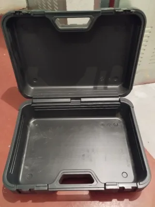 Maleta de plástico resistente, ideal para guardar y transportar herramientas. Usada. También sirve para guardar cosas o figuras de Warhammer. - Diseño robusto. - Asa para fácil transporte. - Cierres seguros.