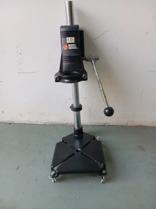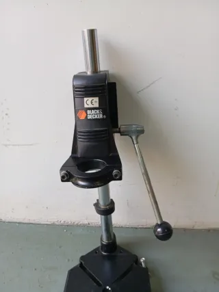 Soporte para taladro de la marca Black&Decker. Diseñado para mayor estabilidad y precisión en tus trabajos. - Base cuadrada negra. - Columna metálica. - Asa para ajuste de altura. En perfecto estado. Sólo le falta una tuerca para la sujeción. 16 euros