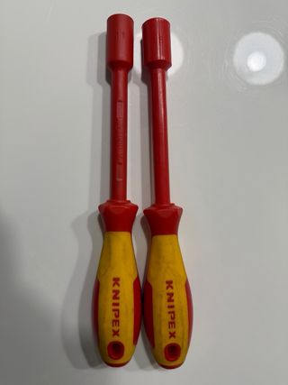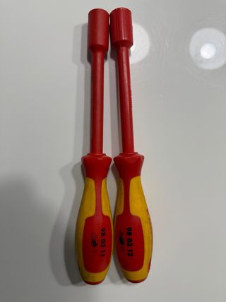 Juego de dos llaves de vaso aisladas Knipex. Nuevas a estrenar. - Medidas de 11 mm y 12 mm. - Aislamiento de 1000V. - Mangos ergonómicos en rojo y amarillo.