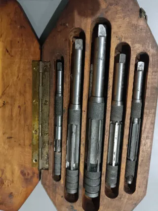Conjunto de escariadores Virax regulables en su caja de madera. - Caja de madera con bisagras. - Incluye 5 escariadores de diferentes tamaños. son cuchillas de corte rotatorio para agrandar y alisar agujeros en metal eliminando imperfecciones. - vintage, poco uso pero antiguo. - la caja tiene una pequeña muesca pero esta bien y se abre perfectamente. Tiene cierre de seguridad. - Se hacen envíos.