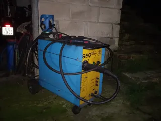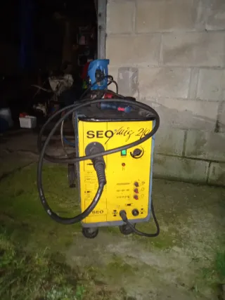 Equipo de soldadura marca SEO, modelo Mig 210. - Color amarillo. - Ruedas para fácil transporte. - Panel de control con selector de potencia y selector de gas.