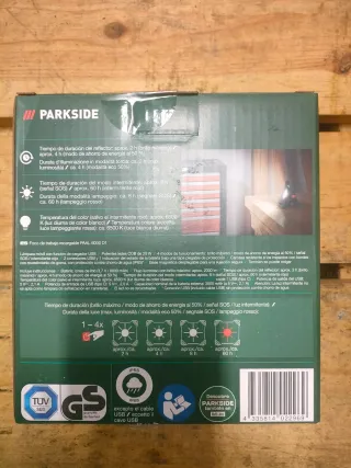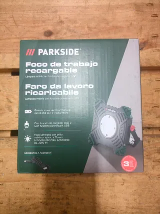 Foco de trabajo LED recargable de la marca Parkside. Ideal para diversas tareas. - Batería de iones de litio de 6000 mAh. - Función powerbank USB. - Flujo luminoso máximo de aprox. 2000 lúmenes. - Incluye cable de carga USB.