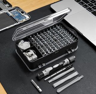 Juego de destornilladores de precisión con múltiples puntas para reparaciones. - Incluye mango de destornillador. - Variedad de puntas de diferentes tipos y tamaños. - Herramientas de palanca y ventosa incluidas.