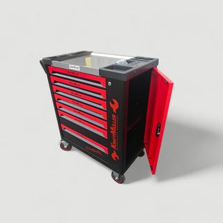 Carro de herramientas de la marca Kraftmuller con 7 cajones. Ideal para organizar y almacenar tus herramientas de forma eficiente. - Color: Rojo y negro. - Marca: Kraftmuller. - Número de cajones: 7. El precio sin iva