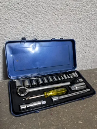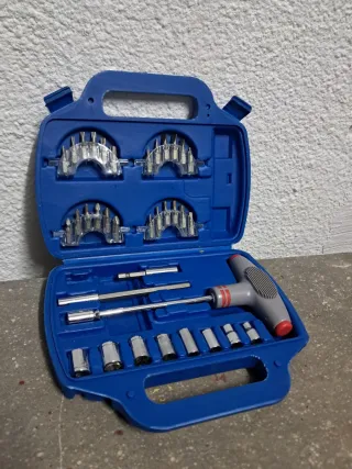 Maletín de herramientas de plástico azul con varios accesorios. - Incluye mango en T y extensiones. - Juego de vasos. - Puntas de destornillador.