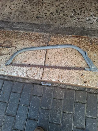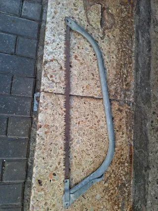 Arco de sierra con hoja dentada para cortar madera. - Hoja de sierra de metal. - Marco curvo de metal.