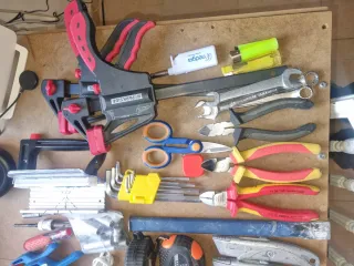 Lote de herramientas variadas, ideal para reparaciones y proyectos. - Incluye destornilladores de diferentes tamaños. - Pinzas y alicates. - Nivel.