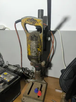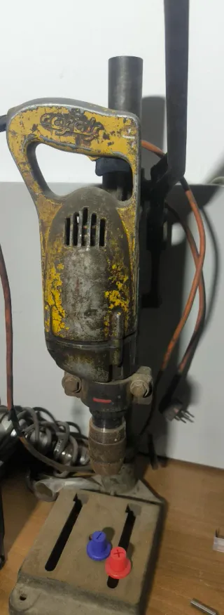 Se vende taladro antiguo con su soporte. - Taladro de color amarillo y gris. - Soporte metálico con base.