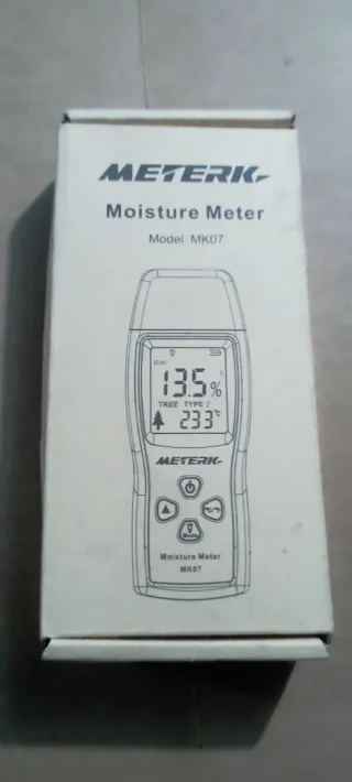 Medidor de humedad METERK modelo MK07. - Pantalla digital. - Indicador de tipo de árbol. - Lectura de humedad en % y temperatura en °C.