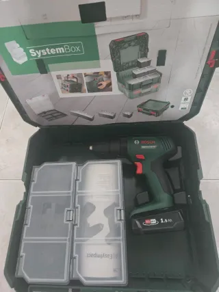 Taladro a batería Bosch en su maletín SystemBox. - Incluye taladro, batería y maletín. - Batería de 18V 1.5Ah.