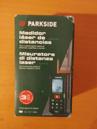 Medidor láser de distancia Parkside. - Modelo: PLDM 25 A1 - Rango de medición: 0.075-25 m - Precisión: ± 2 mm - Incluye 2 pilas AAA