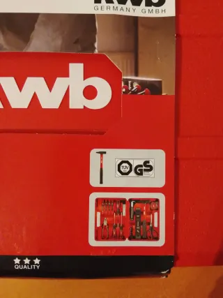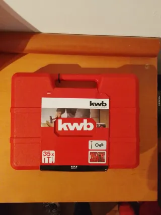 Maletín de herramientas de la marca KWB con 35 piezas. - Incluye martillo, alicates, destornilladores y tijeras. - Certificación GS y TÜV. - Diseño compacto y portátil.