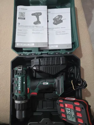 Se vende taladro atornillador Parkside performance de 12V. Incluye accesorios y maletín. - Taladro atornillador inalámbrico. - Batería de 12V. - Cargador. - Juego de brocas y puntas. - Maletín de transporte.