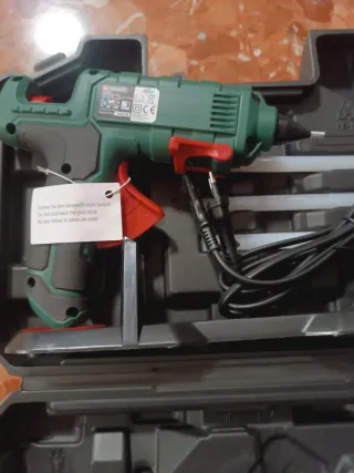 Pistola de silicona caliente inalámbrica de la marca Parkside. Ideal para trabajos manuales y reparaciones. - Diseño compacto y ergonómico. - Mango de color rojo. - Incluye maletín de transporte. Nueva sin usar
