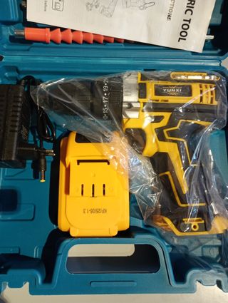 Taladro, atornillador, percutor Inalámbrico Nuevo con dos Baterías; ideal para trabajos de bricolaje y construcción. Incluye: - Taladro, atornillador, percutor. - Cargador. - Juego de brocas, puntas y dados. - Alargador para brocas y puntas. - Dos baterías incluidas. - Maletín para transporte Entrego en mano en Castellón Capital o hago envío.